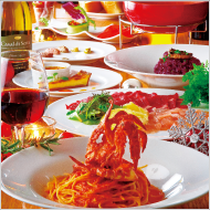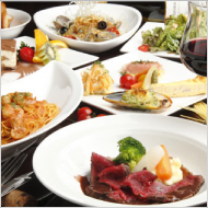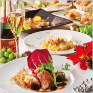 ●前菜5種盛合わせ ・ベーコンと玉ねぎのキッシュ ・ムール貝のエスカルゴバター焼き ・自家製ピクルス ・鶏肉のさっぱりマリネ ・絹ごし豆腐の生ハム巻き ●糸島野菜のグリーンサラダ ●真鯛のアクアパッツァ ●和牛ローストビーフ~赤ワインソース仕立て~ ●海老のトマトクリームスパゲッティー ●デザート盛り合わせ ●バケット