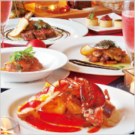 ●三種のミニタルト●自家製サーモンの燻製軽い炙りのサラダ仕立て●フォアグラのプランチャ林檎のキャラメリゼ添えバルサミコソースチョコ風味●オマール海老のロースト三種 の野菜のミルフィーユ仕立て●鹿肉のグリルフレッシュベリーのソーストリュフ風味のジャガイモ添え●シェフ特製クリスマスデザートの盛り合せ