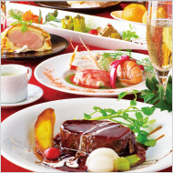 ●アミューズブッシュサツマイモのクリームスープ●オードブル3種(フランス産フォアグラのテリーヌ/ノルウェーサーモンのミ・キュイ/アヴォカドと車海老のファルシキャビアのせ) ●フランス産鴨胸肉とオレンジのパイ包み焼きバルサミコソー ス●天然鯛と手長海老のクネルビーツとバジルの2種のソース クリスマスカラー仕立て●鹿児島県産和牛ホホ肉の赤ワイン煮 2011バージョン●クリスマスデザート●胚芽ロール