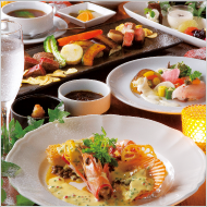●前菜 ●スモークサーモンのカルパッチョ ●香味野菜のバーニャ・カウダ ●牛タンのパイシチュー ●バケット ●白身魚のアクアパッツァ ●黒毛和牛の炙りフォアグラ添え ●チーズのリゾット ●デザートプレート ●コーヒー or 紅茶