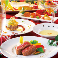 ●冬野菜と合鴨のジュレ昆布〆めした真鯛と海の幸のポピエット ●和牛テール風味のコンソメスープかわいいノエルを添えて… ●甘鯛のうろこ焼き手長海老緋扇貝のソテー ~レモンバターソース~ ●イベリコ豚黒胡椒焼特選和牛ステーキ(フィレ・サーロイン) ●旬の野菜鉄板焼 ●ガーリックライス ●赤出し ●香の物 ●三種のデザート ●コーヒー