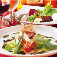 ●地ダコとホタテのマリネ ●産直野菜のバーニャカウダ ●フォアグラとナスのマリアージュ ●スズキのポワレ ニース風 ●牛ホホのミジョテ赤ワインソース ●サザエと木の子のペペロンチーノ ●クリスマス特別デザートプレート